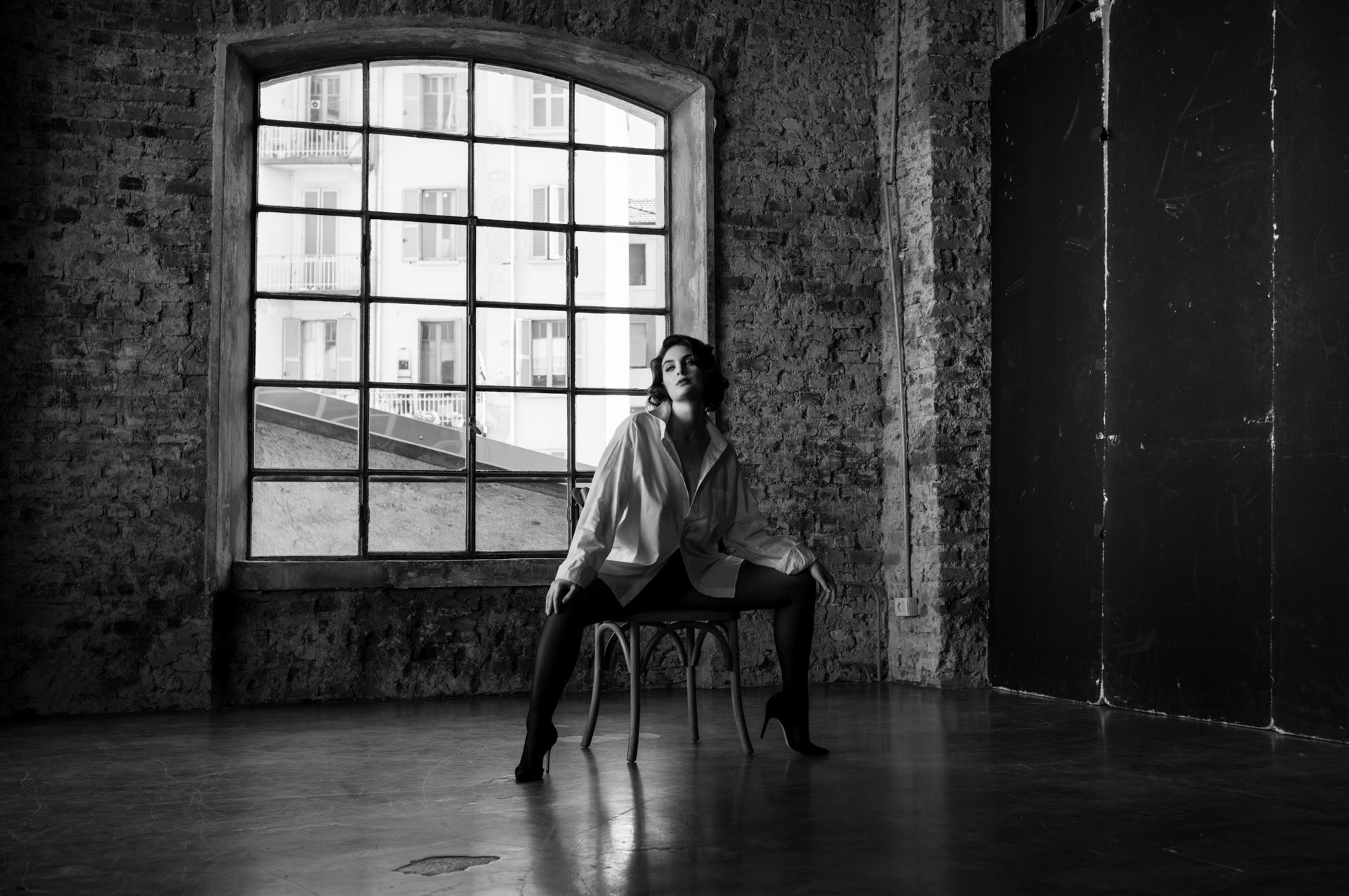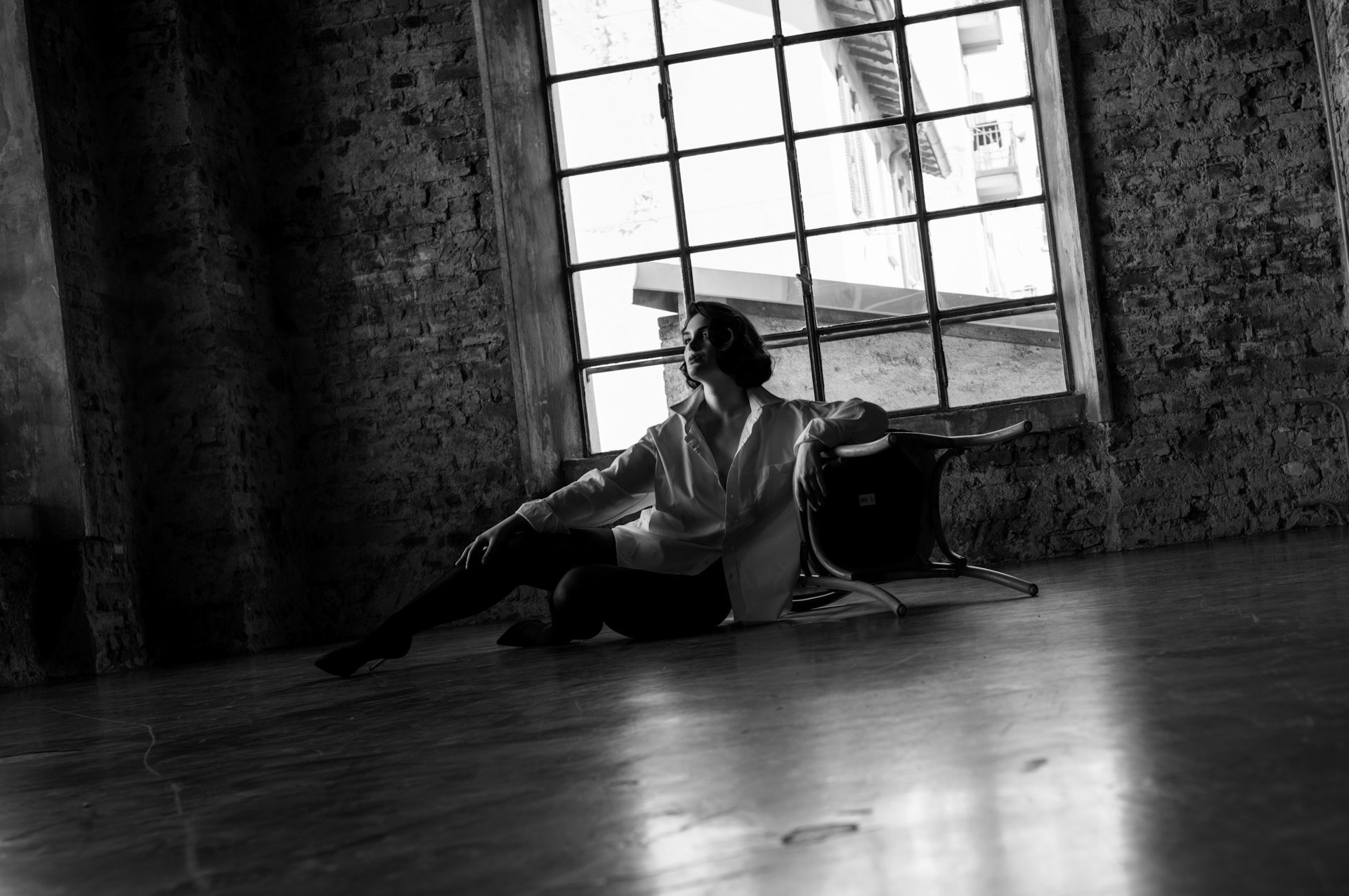 At Cross Studios Milano, where concrete floors meet exposed brick and iron beams stretch overhead, Beatrice brought an effortless contrast—refined yet raw, delicate yet bold. In the first look, she wore a crisp white button-down and black stockings, an understated boudoir aesthetic that felt as effortless as it was striking. The oversized shirt draped loosely, catching the light as she commanded attention. Her piercing blue eyes were magnetic, drawing warmth into the stark surroundings. Every movement—subtle shifts in posture, a glance toward the lens—was natural, unforced. The textures around her, rough and industrial, only amplified the softness she carried.